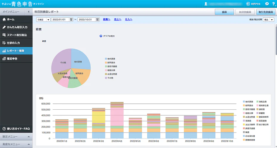 日別取引レポートや科目別損益レポートでは、「売上や仕入・経費の推移」や「各経費の使用割合」など、個人事業の業績や経費削減に役立つ情報の閲覧が可能です。