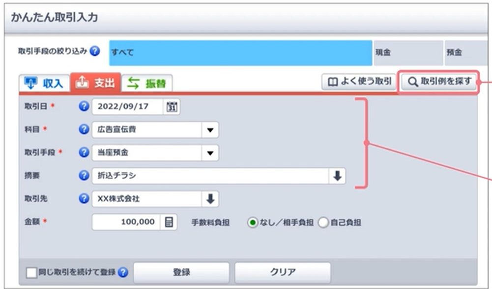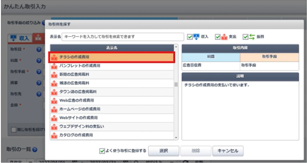 画面右上の「取引例を探す」をクリックすると、解説付きの一覧から勘定科目を選択できるので迷いにくい。