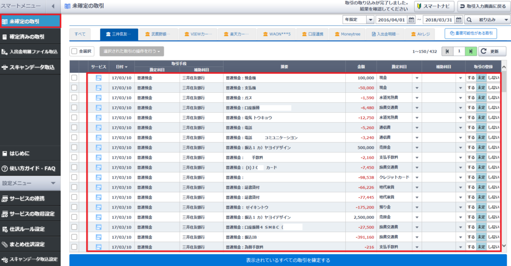 学習機能により使えば使うほど帳簿入力の精度がアップするため、最終的には取込内容を確認して「確定ボタン」を押すだけで帳簿入力が完了するようになります。