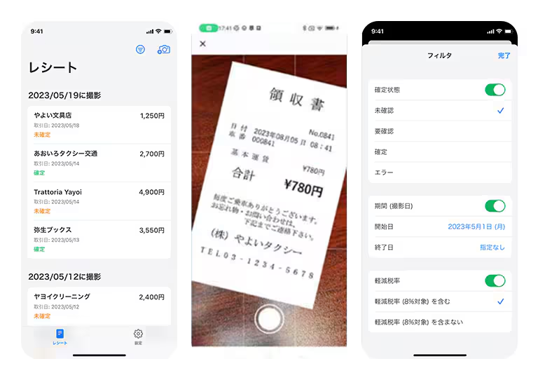 上記の「弥生レシート取込アプリ」は、レシートをスマートフォンで撮影して「スマート取引取込」で自動的に登録できるアプリです。