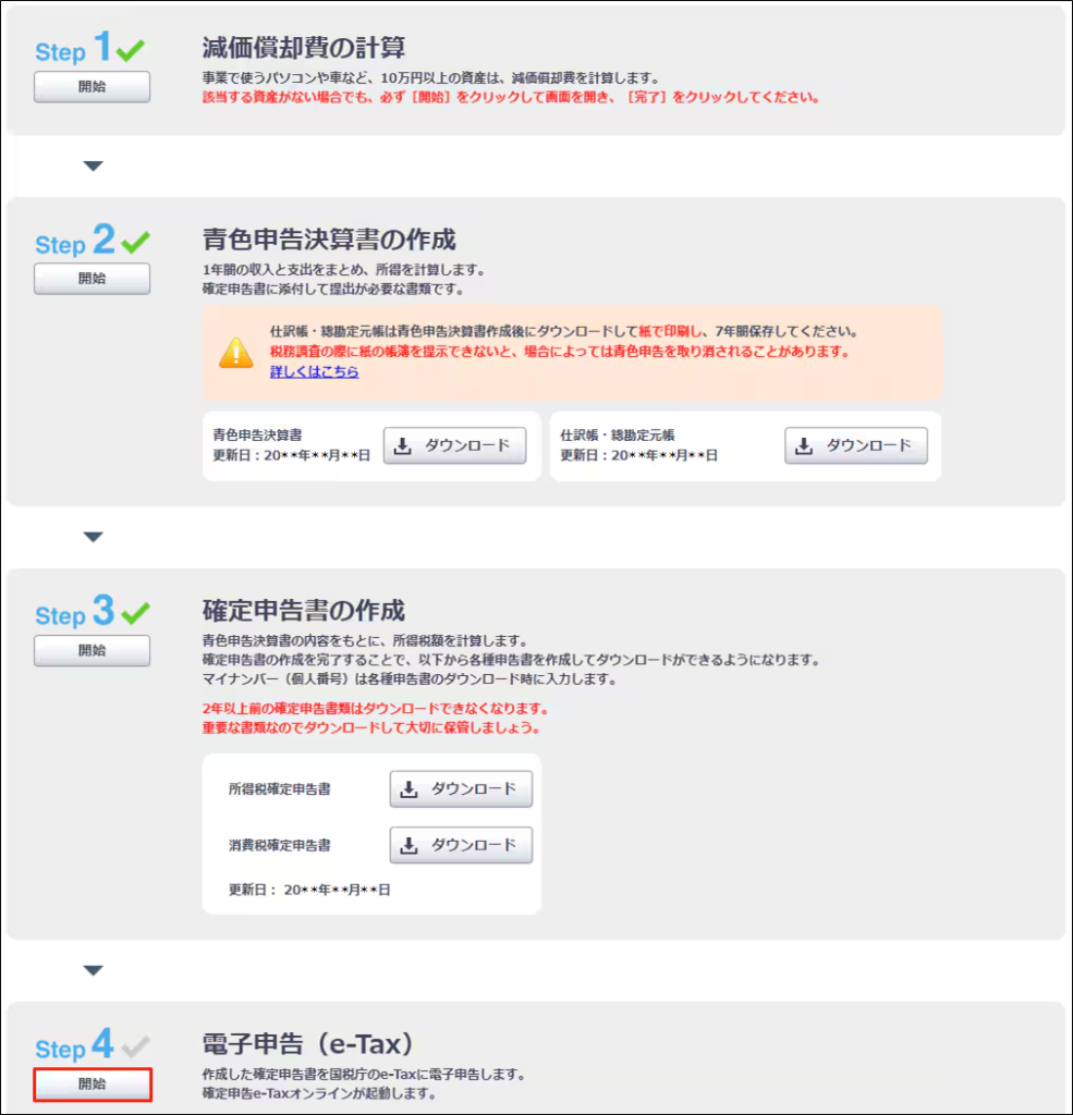 やよいの青色申告オンラインでは、ステップ1~ステップ4の順番で確定申告の作業を進めていきます。
